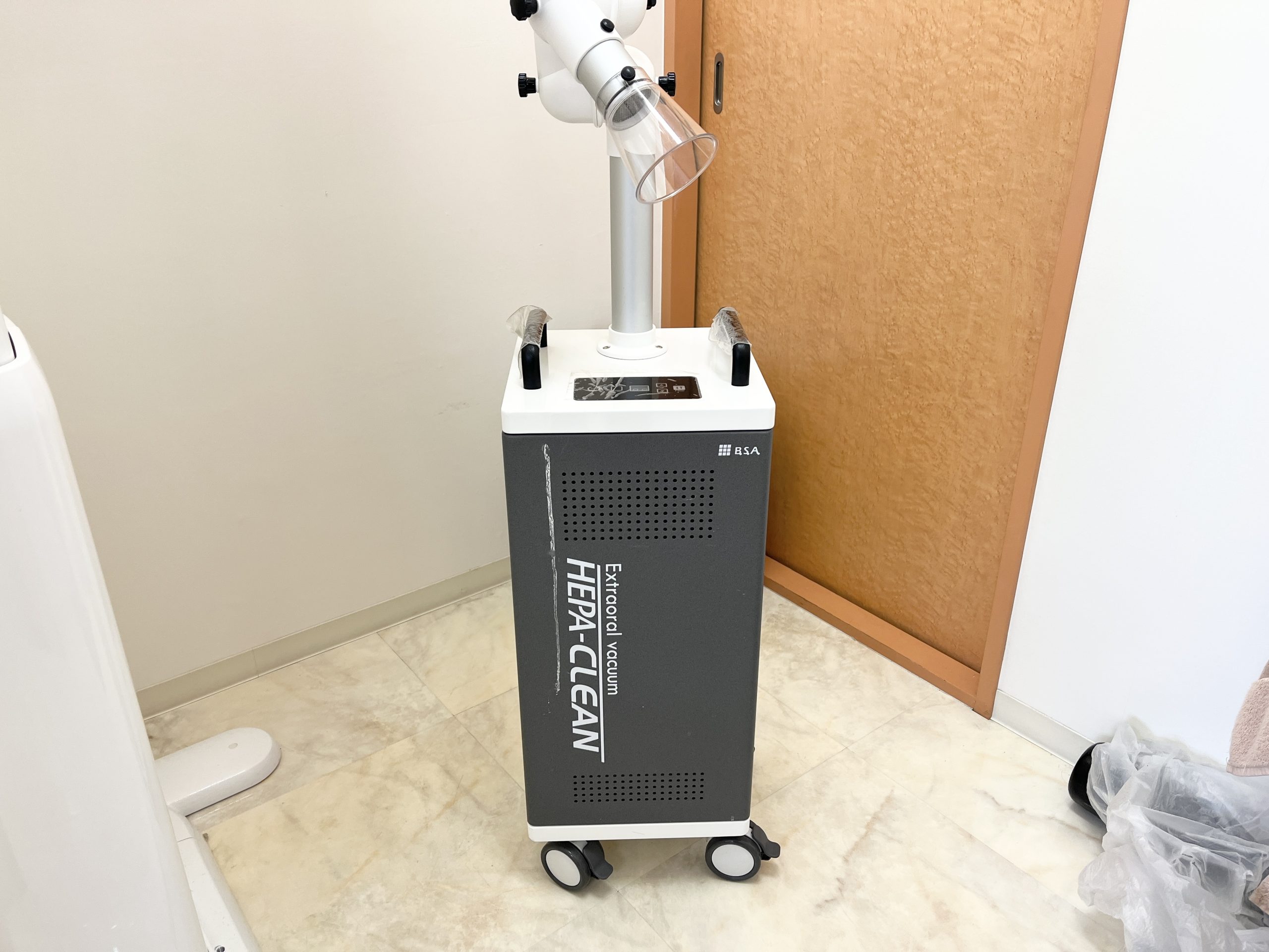 口腔外バキュームは、治療中に飛び散る有害な粉塵や、切削した細かな物質を吸引し、診療室内をクリーンに保つことができます。