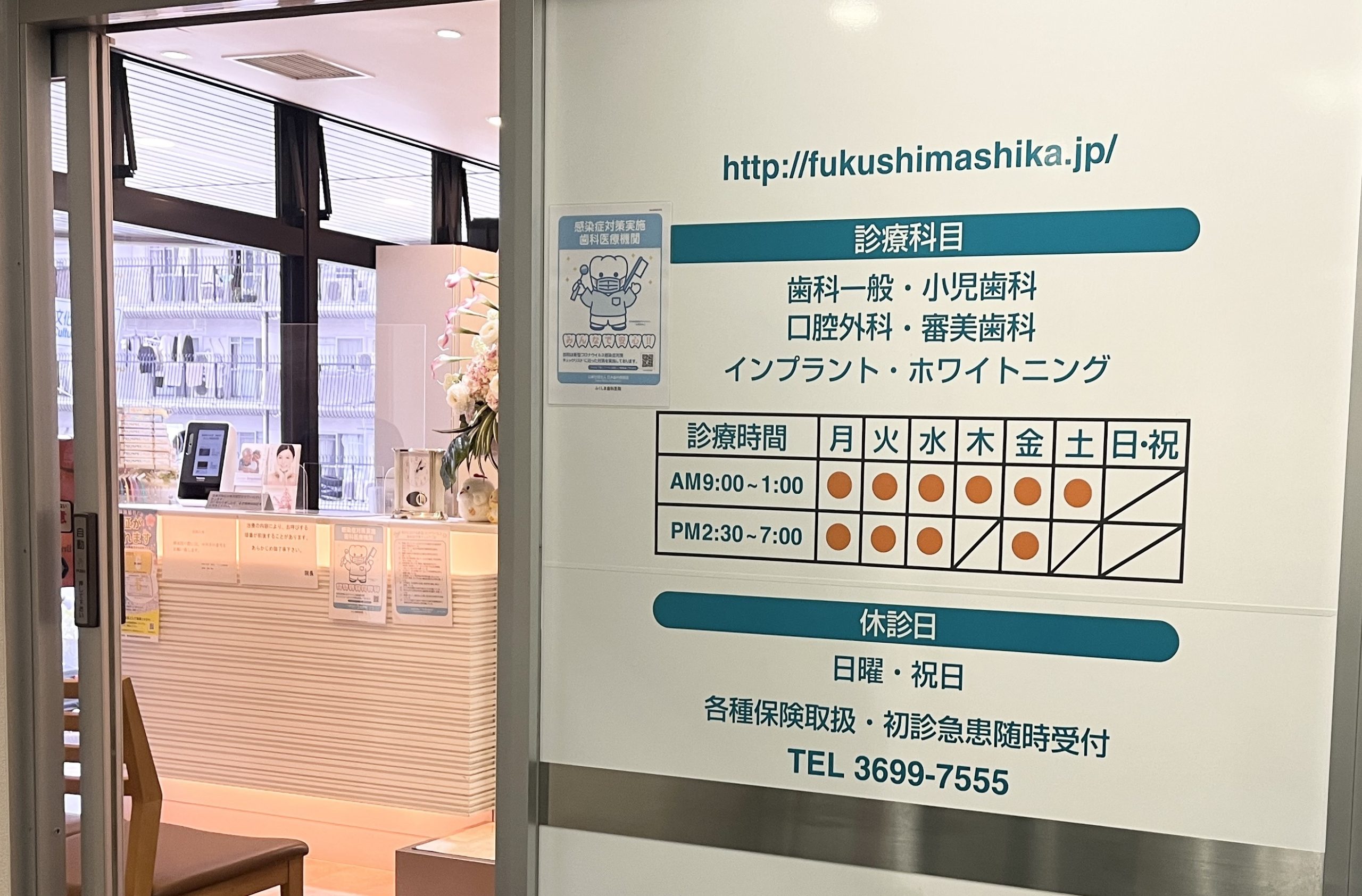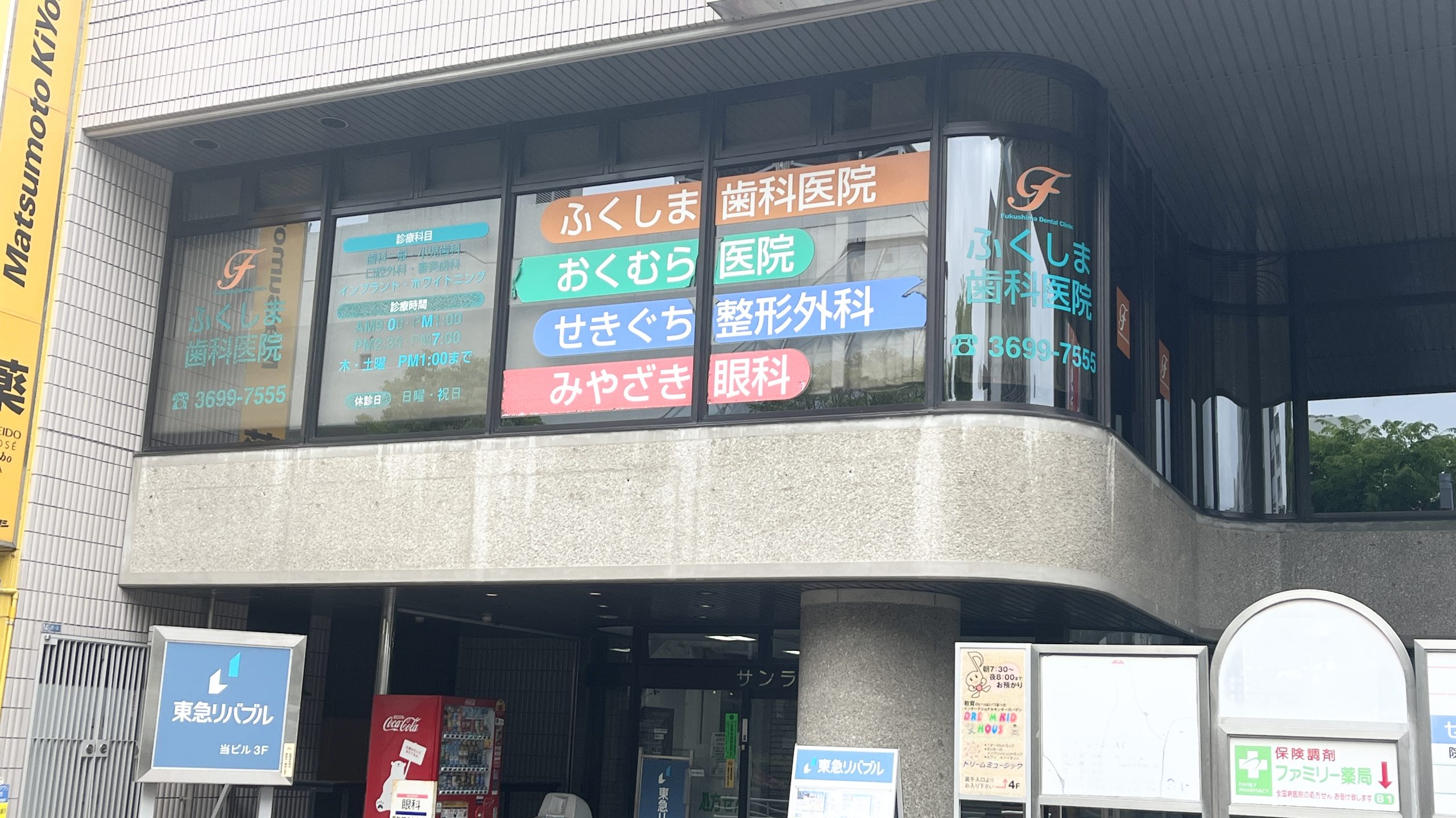 左手奥のエレベーターで2階に上がっていただき、降りてすぐ右手がふくしま歯科医院です。